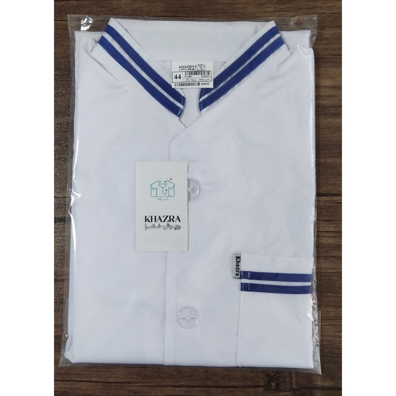 روپوش آشپزی سفید با نوار آبی آستین کوتاه خضرا (کد 41401) در شرکت تبیان طب دیبا رازی طراحی و تولید شده است .پارچه این محصول ترگال میباشد . از ویژگی های پارچه این محصول وزن کم و عدم ایجاد حساسیت و عدم تعریق می باشد . پارچه ترگال از پارچه تترون ضخیم تر و از پارچه کجراه نازکتر می باشد . برای انتخاب سایز مناسب ، یک روپوش قدیمی را از پشت اندازه گیری کنید و با جدول راهنمای سایز که در تصاویر روپوش قرار داده شده مقایسه کنید .دقت کنید حتما براساس جدول ، سایز خودتان را انتخاب کنید و سایز روپوش ، بامدل یا برند دیگر را معیار انتخاب سایز قرار ندهید . کالایی که دریافت میکنید دارای مارک های دوخته شده (خضرا) می باشد.