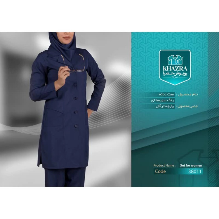 ست روپوش و شلوار و مقنعه اتاق عمل سورمه ای زنانه خضرا مدل یاس کد 38011 در شرکت تبیان طب دیبا رازی طراحی و تولید شده است . پارچه این محصول ترگال می باشد . از ویژگی های این محصول عدم ایجاد حساسیت و عدم تعریق و وزن کم میباشد.پارچه ترگال کمی ضخیم تر از پارچه تترون میباشد ، که باعث افزایش عمر محصول در برابر ست های تترون میگردد .برای انتخاب سایز مناسب ، یک ست قدیمی را از پشت اندازه گیری کنید و با جدول راهنمای سایز که در تصاویر قرار داده شده مقایسه کنید .دقت کنید حتما براساس جدول ، سایز خودتان را انتخاب کنید و سایز روپوش ، بامدل یا برند دیگر را معیار انتخاب سایز ، قرار ندهید . محصولی که دریافت میکنید دارای مارک های دوخته شده خضرا (KHAZRA) می باشد و نوع پارچه و کد محصول روی هر محصول درج شده است .