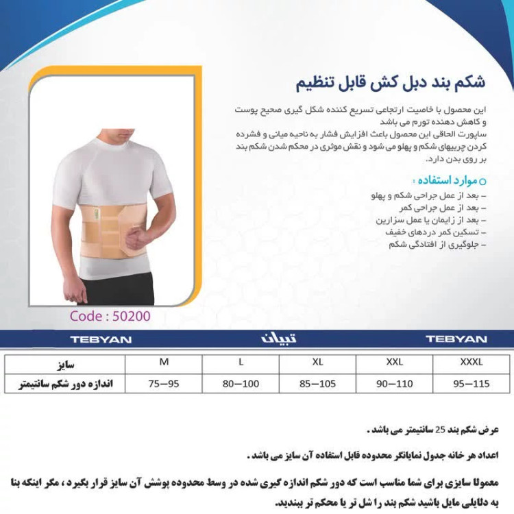 شکم بند طبی قابل تنظیم تبیان ( TEBYAN )کد 50200 در شرکت تبیان طب دیبا رازی تولید شده است . جنس این شکم بند کشی و عرض شکم بند 25 سانتیمتر است و دارای کش کمکی میباشد . این محصول دارای مجوز رسمی سازمان غذا و دارو می باشد. برای انتخاب سایز مناسب ، به جدول سایز مراجعه کنید .