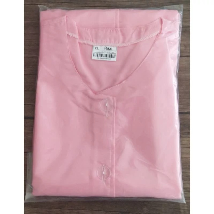 روپوش و شلوار بیمار زنانه رنگ صورتی کد 39602 رازی برای استفاده بیمار در منزل یا بیمارستان تولید شده است . پارچه این محصول تترون می باشد . برای انتخاب سایز مناسب ، یک روپوش قدیمی را از پشت اندازه گیری کنید و با جدول راهنمای سایز که در تصاویر روپوش قرار داده شده مقایسه کنید .دقت کنید حتما براساس جدول ، سایز خودتان را انتخاب کنید و سایز روپوش ، بامدل یا برند دیگر را معیار انتخاب سایز قرار ندهید .