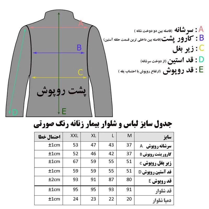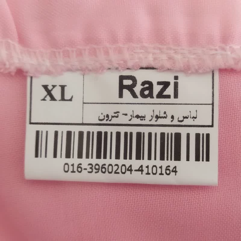 روپوش و شلوار بیمار زنانه رنگ صورتی کد 39602 رازی برای استفاده بیمار در منزل یا بیمارستان تولید شده است . پارچه این محصول تترون می باشد . برای انتخاب سایز مناسب ، یک روپوش قدیمی را از پشت اندازه گیری کنید و با جدول راهنمای سایز که در تصاویر روپوش قرار داده شده مقایسه کنید .دقت کنید حتما براساس جدول ، سایز خودتان را انتخاب کنید و سایز روپوش ، بامدل یا برند دیگر را معیار انتخاب سایز قرار ندهید .