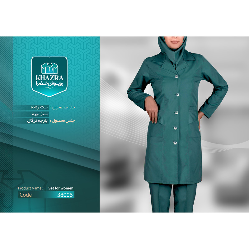 ست روپوش و شلوار و مقنعه اتاق عمل سبز تیره زنانه خضرا مدل یاس کد 38006 در شرکت تبیان طب دیبا رازی طراحی و تولید شده است . پارچه این محصول ترگال می باشد . از ویژگی های این محصول عدم ایجاد حساسیت و عدم تعریق و وزن کم میباشد.پارچه ترگال کمی ضخیم تر از پارچه تترون میباشد ، که باعث افزایش عمر محصول در برابر ست های تترون میگردد .برای انتخاب سایز مناسب ، یک ست قدیمی را از پشت اندازه گیری کنید و با جدول راهنمای سایز که در تصاویر قرار داده شده مقایسه کنید .دقت کنید حتما براساس جدول ، سایز خودتان را انتخاب کنید و سایز روپوش ، بامدل یا برند دیگر را معیار انتخاب سایز ، قرار ندهید . محصولی که دریافت میکنید دارای مارک های دوخته شده خضرا (KHAZRA) می باشد و نوع پارچه و کد محصول روی هر محصول درج شده است .