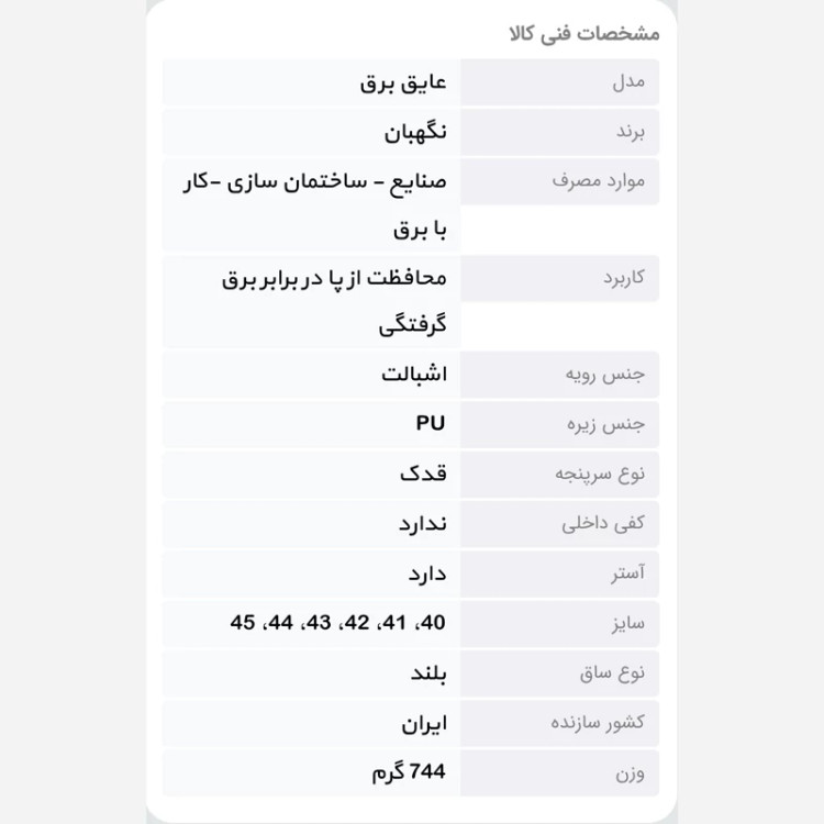 برای تولید زیره کفش از متریال بسیار مرغوب PU استفاده میشود. این ماده بسیار سبک بوده و از ویژگیهای ضد لغزش و ضد سایش خوبی برخوردار است. کفی این کفشها از پلاستیک و مواد با کیفیت تولید میشود و از تعرق پا جلوگیری میکند. در حقیقت، عدم وجود قطعات فلزی در تولید این کفش سبب میشود که این محصول در برابر ولتاژهای بالا تا 380 ولت نیز مقاومت کافی داشته باشد.