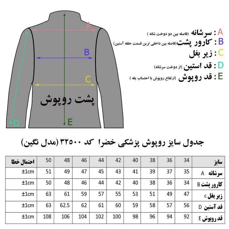 برای انتخاب سایز دقیق، یک روپوش قدیمی را از پشت اندازهگیری کرده و با جدول راهنمای سایز موجود در تصاویر محصول مقایسه نمایید.