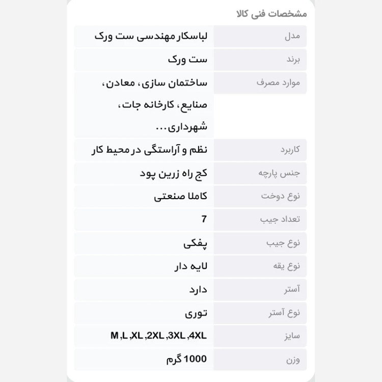 لباسهای کار مهندسی در چندین نوع مختلف با جنسها و مدلهای گوناگون طراحی و تولید شدهاند. علت وجود تفاوت در طرح و مدلهای لباسهای کار مهندسی بهمنظور تفکیک کارکنان پروژه است؛ بهعنوانمثال لباس کار مهندسی(setwork) برای مهندسان ناظر با مهندسان برق یا مدیر پروژه متفاوتتر از لباس کار افراد مشغول سر ساختمان خواهد بود. در تمامی موارد نامبرده جنس پارچه و نوع دوخت آن از اهمیت بالایی برخوردار است. جنس پارچه باید بهگونهای باشد که از تعریق جلوگیری کند و فرایند تهویه هوا را بهخوبی انجام دهد. دوخت محکم لباسها موجب میشود تا طی مدتزمان طولانی استفاده دچار پارگی نشوند و با بازدهی بالا ایفای نقش کنند. لباس کار مهندسی ست ورک (setwork) در چندین رنگ مختلف همراه با دستکش و کلاه ست قابلارائه است. متقاضیان با خرید ست کامل این لباس میتوانند با نظم و تجهیزات کامل به فعالیت خود بپردازند. سایزبندی این لباسها بهگونهای است که افراد با هر سایز و قدی بتوانند از آن استفاده کنند.