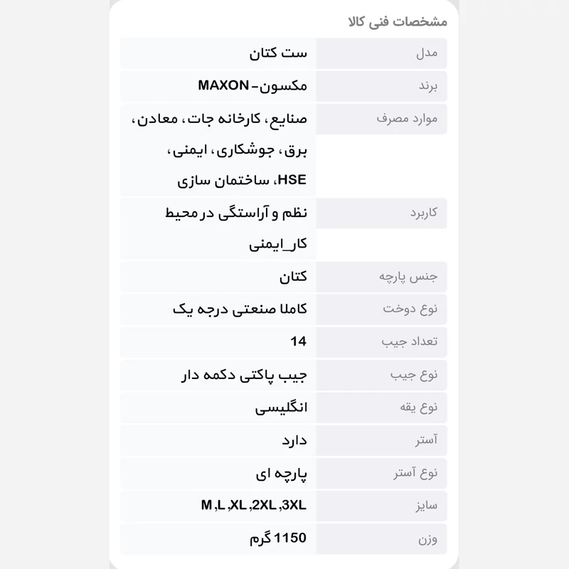 این لباس با پارچه 100درصد کتان با تبادل هوایی و سازگاری با محیط میباشد که باعث راحتی بیشتر کاربر حین کار میباشد ، جنس پارچه این لباس کار کتان مقاومت بالایی در برابر کشش و فشار ، محلول های رقیق و اسیدی و قلیایی دارد.
