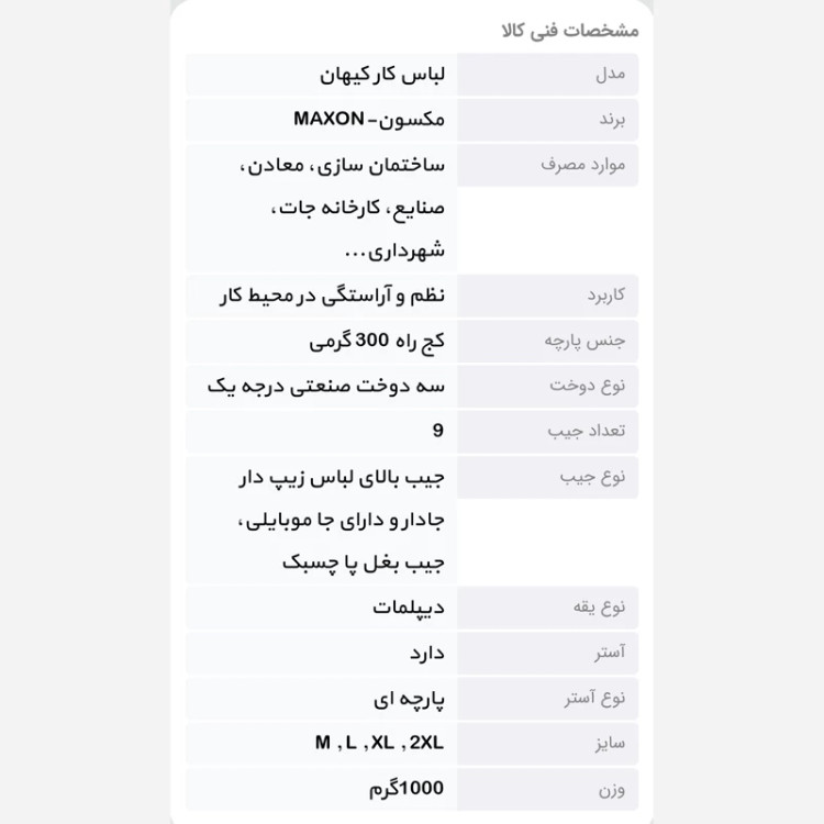لباس کار کیهان با دوخت کاملا صنعتی با پارچه کجراه صنعتی 300 گرمی و آستری پارچه ای با تبادل هوایی مناسب و سازگار با محیط است از این رو برای تمام فصول مناسب است.